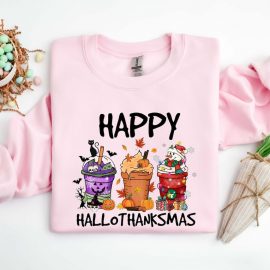 Happy Hallothanksmas Sweatshirt Coffee Pumpkin Spice Iced Snowmen Pink Sweatshirt II