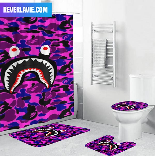 Baph Camo Signature Shark In Purple Camo Bath Rug Set and Shower Curtain HG