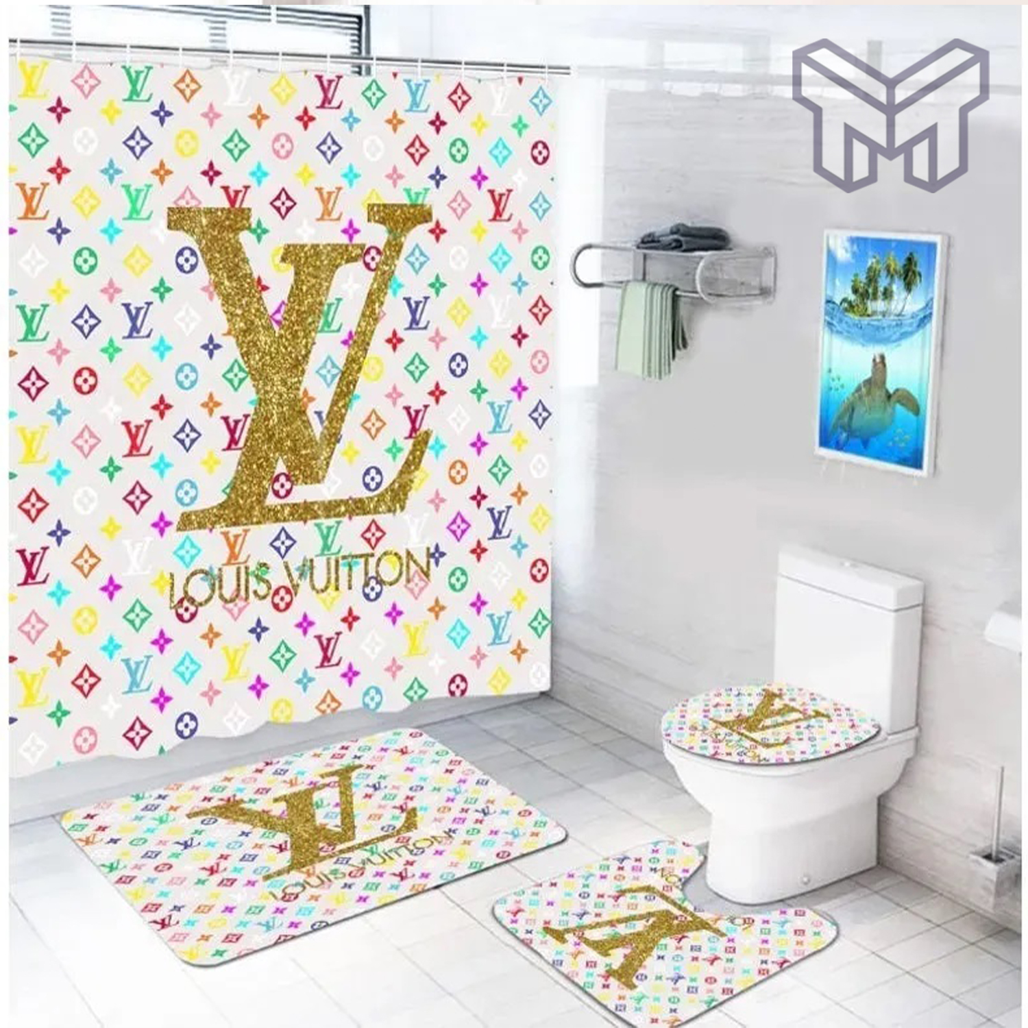 LV2 LV Bathroom Set Luxury Shower Curtain Bath Rug Mat Home Decor HT