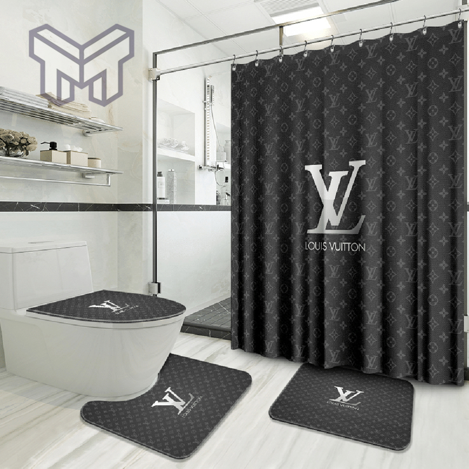 LV2 Gray Fashion Logo Luxury Brand Bathroom Set NNA Home Decor Shower Curtain And Rug Toilet Seat Lid Covers Bathroom Set NNA