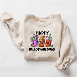 Happy Hallothanksmas Sweater Coffee Lover Design Sand Color Sweater