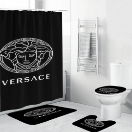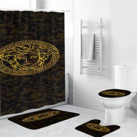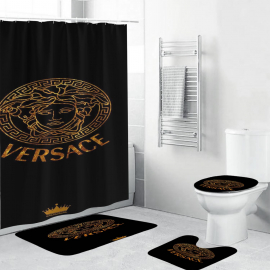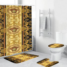 VSC Royal Gold And Black Logo And Signature Baroque Bath Rug Set and Shower Curtain HG