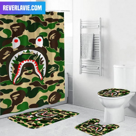 Baph Camo Signature Shark In Green Camo Bath Rug Set and Shower Curtain HG
