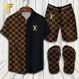 lv2 Brown Black Logo Luxury Brand Hawaiian Shirt And Shorts Or Flip flops HG